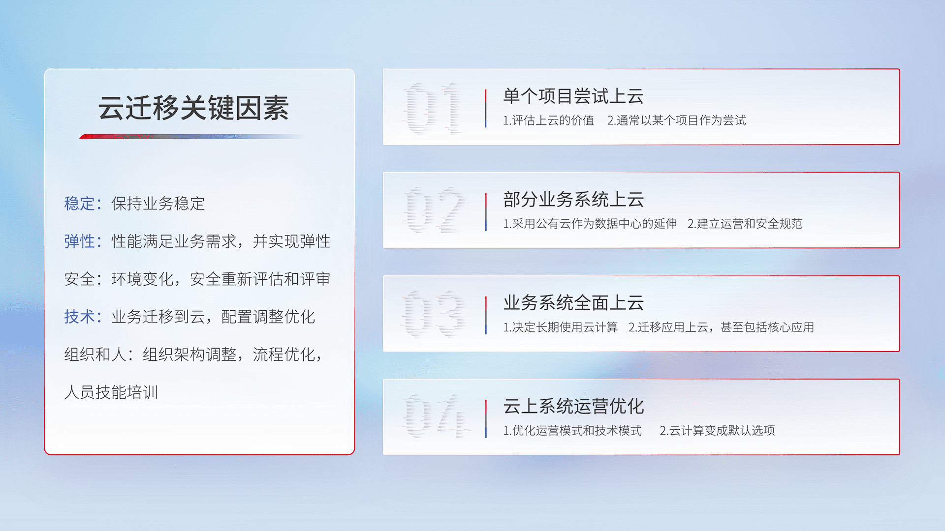 结合实际业务,,,,从规划设计、、、云平台选型、、、、云原生改造、、数据迁移、、、、集成交付,,迁移全过程为客户识别最佳上云路径,,,做好风险识别管理,,,,设计网络架构、、、身份权限、、安全审计合规、、、操作审计、、日志审计、、、、监控告警策略、、、多站点容灾设计等,,对云上基础设施进行整体规划,,,提升IT治理水平,,,以满足弹性、、、高可用、、、、高性能的需求。。。