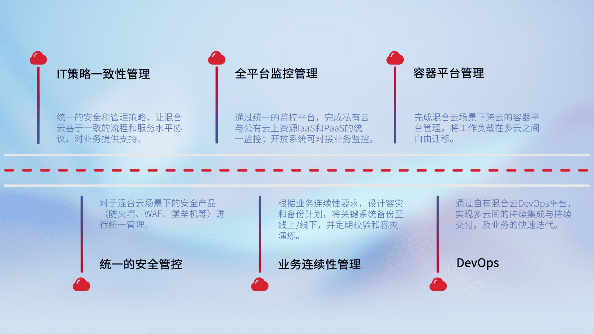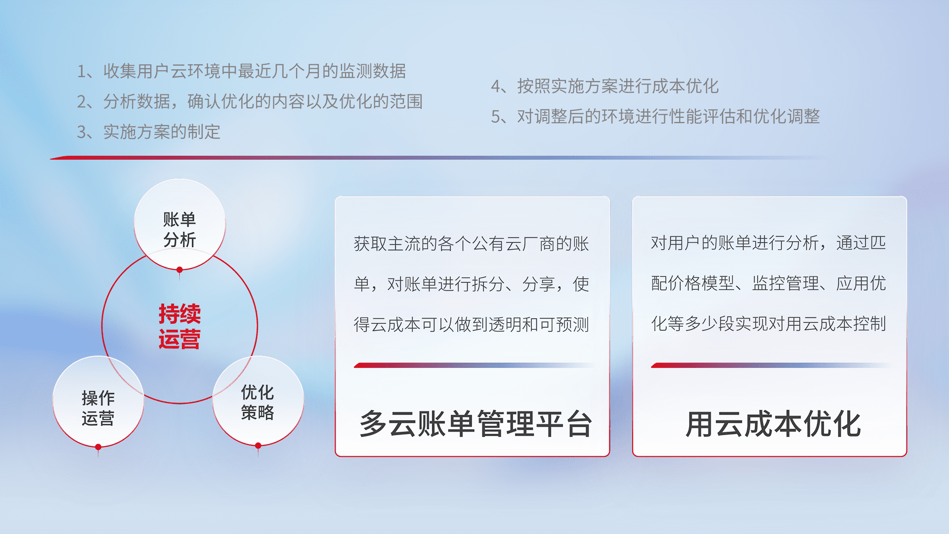 通过多云纳管,,,以统一的资源数据模型把客户的云资源进行抽象和封装,,,,进而实现对多云资源的统一操作,,保障云资源管理的可靠性、、稳定性与可用性。。量身定制化运维内容,,,,配置、、、、开发运维、、补丁管理、、、、备份、、、、监控、、、、认证和访问管理、、审计和日常巡检等,,保障在用云过程中的可靠度,,稳定度以及高可用率。。